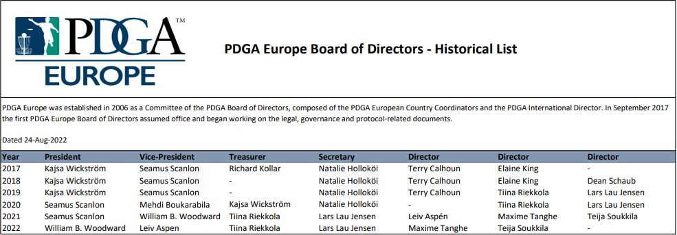 Hace unas semanas la PDGA Europa convocó elecciones para 3 puestos vacantes en la directiva, tras la salida de la tesorera Tiina Riekkola, el secretario Lars Lau Jensen, el director Maxime Tanghe y la directora Teija Soukkila. No obstante la mesa de la junta no se compondría solo por estos tres miembros electos, sino que lo haría con otros tres miembros más que serían internamente nominados por la PDGA Europe.